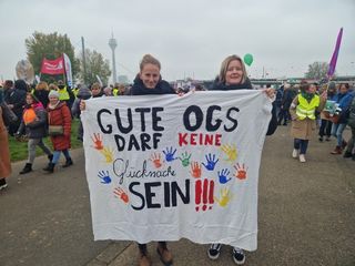 Großdemo in Düsseldorf am 13.11.2024. Die NRW-Landesregierung will im kommenden Jahr bei einigen Sozialausgaben Kürzungen vornehmen. So riefen die Verbände zu einer großen Demo auf. Auch die OGS der Wiehagenschule war durch Nele Kleimann und Ramona Trifan unter den 32 000 Menschen vertreten.